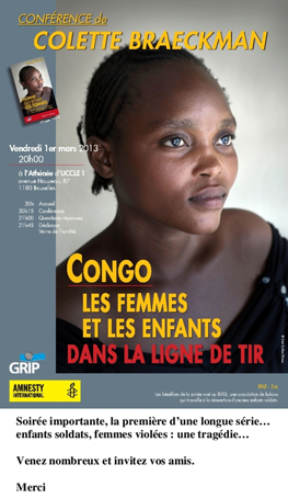 Le vendredi 1er mars à 20h à l’Athénée d’Uccle 1, avenue Houzeau, 87 1180 Bruxelles et à l’occasion de la sortie de son livre « Congo - Les femmes et les enfants dans la ligne de tir » aux éditions du GRIP, Colette Braeckman organise une conférence sur ce sujet.