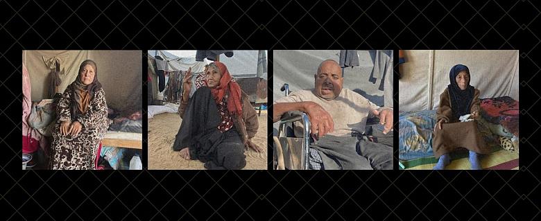 Samira Al Shawa, 88 ans, utilisait un déambulateur pour se déplacer de manière autonome. Elle vit aujourd’hui dans un camp pour personnes déplacées, où elle ne peut plus marcher du tout sur le terrain sablonneux. Elle passe la plupart du temps allongée sur un lit improvisé dans sa tente. Des cantines communautaires fournissent de la nourriture à sa famille, mais celle-ci est insuffisante et ne couvre pas ses besoins nutritionnels. Elle a perdu une vingtaine de kilos depuis octobre 2023.