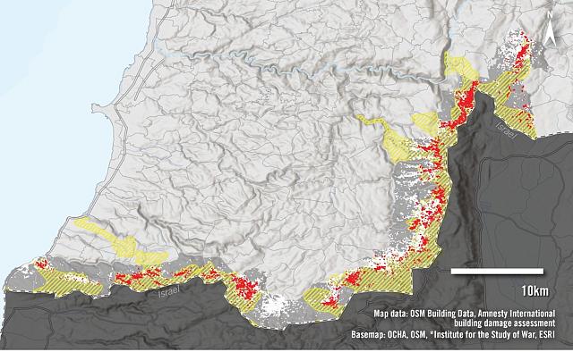 Les images satellite montrent que les agglomérations de Yarin, Dhayra et Boustane, dans le district de Tyr, ont été les plus touchées, avec plus de 70 % de leurs bâtiments détruits au cours de la période examinée. Sept autres agglomérations ont vu plus de la moitié de leurs structures détruites.