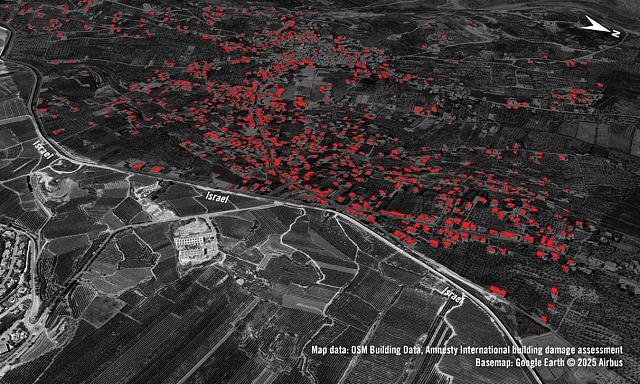 L’analyse visuelle de l’infographie et la comparaison avec des images prises au sol et des images satellite montrent clairement que la destruction de structures civiles a largement outrepassé les bâtiments qui auraient abrité des infrastructures du Hezbollah. L’analyse d’Amnesty International montre que l’armée israélienne contrôlait au moins partiellement la zone dès le 28 octobre, comme en ont témoigné les journalistes qui se sont rendus dans la ville. Les destructions se sont poursuivies même après l’entrée en vigueur du cessez-le-feu le 27 novembre 2024.