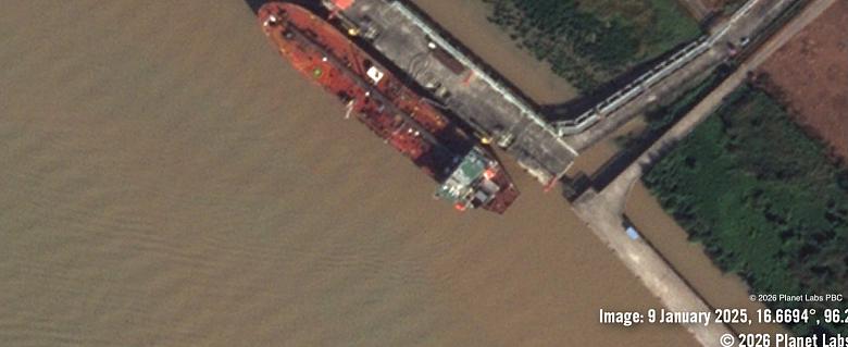 • le HUITONG 78 (IMO 9646479, désormais rebaptisé BARAAWE 1) – ce navire battant pavillon chinois a livré une cargaison en juillet 2024, faisant suite à au moins neuf autres livraisons en 2023/2024. Le 12 juillet, il a accosté au terminal pétrolier de Myan Oil à Yangon, tandis que son système radar AIS était vraisemblablement désactivé. D’après l’analyse des données radar et des images satellite, le chargement a probablement eu lieu dans la zone d’ancrage au large de Fujairah, aux Émirats arabes unis, zone offshore dédiée à l’avitaillement, aux transbordements d’hydrocarbures navire-navire et autres services maritimes, où le HUITONG 78 a été aperçu entre le 13 et le 26 juin 2024.