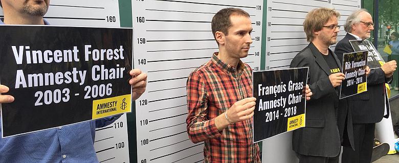 Afin de demander la libération immédiate de Taner Kiliç, le président de la section turque d’Amnesty International, une action symbolique a été menée par l’ensemble du mouvement Amnesty International jeudi 15 juin dans plusieurs pays. En Belgique, l’action a eu lieu devant l’ambassade de Turquie à Bruxelles, où les présidents d’Amnesty Belgique francophone et d’Amnesty Vlandereen se sont faits menotter en soutien à leur homologue turc. D’anciens présidents des deux sections étaient également présents. À cette occasion, près de 15 000 signatures récoltées en Belgique pour la libération de Taner Kiliç ont été remises à l’ambassade.