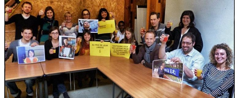 2) Vous envoyez ensuite la ou les photos à Philippe Givron, coordinateur Chine, philippe.givronATgmailPOINTcom (remplacez le AT par « @ » et POINT par « . » avant le 20 avril 2014 avec un message de sympathie (maximum 2 phrases). 3) Notre coordinateur les enverra ensuite à l’équipe Amnesty d’Honk Kong. Cette dernière les diffusera sur les réseaux sociaux chinois la semaine qui est réservée aux photos et messages venant de notre section AIBF (début mai). Les autres sections d’Amnesty les alimenteront pour les autres semaines d’avril et de mai. |